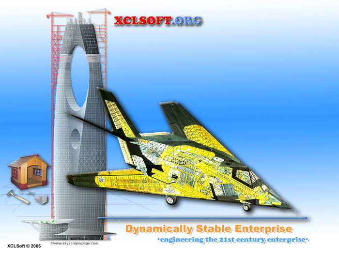 Almost everyone can agree that 25 years ago IBM started a revolution. The PC platform, created and standardized by IBM, has a flexibility that is unique in the technical world. The microprocessor, a device invented only 10 years prior to the PC by Intel, provided a standard that was flexible by design. The same hardware architecture, built around few simple elements, like memory, Arithmetic Logic Unit, electronic bus, allowed a program to be developed and run on the same machine, and with the same architecture. Countless software applications are taking advantage of this. Before the PC and the microprocessor, each function was implemented hardwired to the architecture. As a result of this revolution, someone can talk about pre- and post-PC era. In today's enterprise architecture, the same pre-PC chaotic era situation exists. Each enterprise function is hardwired by a myriad of applications, each one implemented for a given business model, industry vertical, and even size. Huge efforts, driven by either high consulting fees, or short term agenda, make this hundreds of billions of dollars one of the most inefficient and costly endeavor. XCLSoft, through xclsoft.org, is hoping to change all this, and move from chaos to a clearly driven effort, one in which reusability and open plays a key role. The goal for the Dynamically Stable Enterprise Framework is to act as a catalyst for a new type of infrastructure, one that will have the same fundamental feature as the initial microprocessor-centric designed PC. That feature is the standardization of an enterprise infrastructure, one that uses flexibility-by-design. that the new architecture, capable to support any type of business, regardless of size or vertical, to start the same type of revolution in the business. The solution is based on the integration of operations, change, and technology, one that will make any enterprise efficient and continuously adaptive. Obviously, the design of such an infrastructure has far more elements that the microprocessor, but similar to its architecture, if done correctly, it can be scalable in the future. A simple calculus shows that the number of lines the code required to be written to implement such an infrastructure is in hundreds of billions! Not only is very difficult for a single company to ever even attempt to write alone such an application, but we believe that being open encourage everyone to join the quest for a unique, standardized architecture, one that can be free of patents, or proprietary components. By everyone contributing to its foundations, the effort can go towards building depth instead of width. Please join our efforts to make this a reality! (30 line per day...)